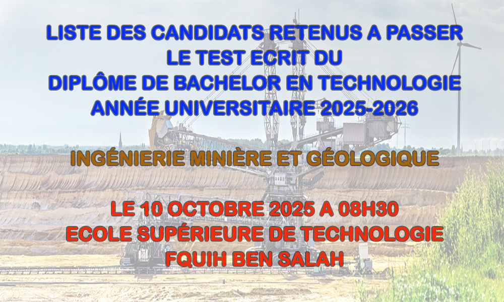 Avis et liste des candidats retenus à passer le test écrit du Diplôme de Bachelor en Technologie Ingénierie Minière et Géologique au titre de l’année universitaire 2025-2026
