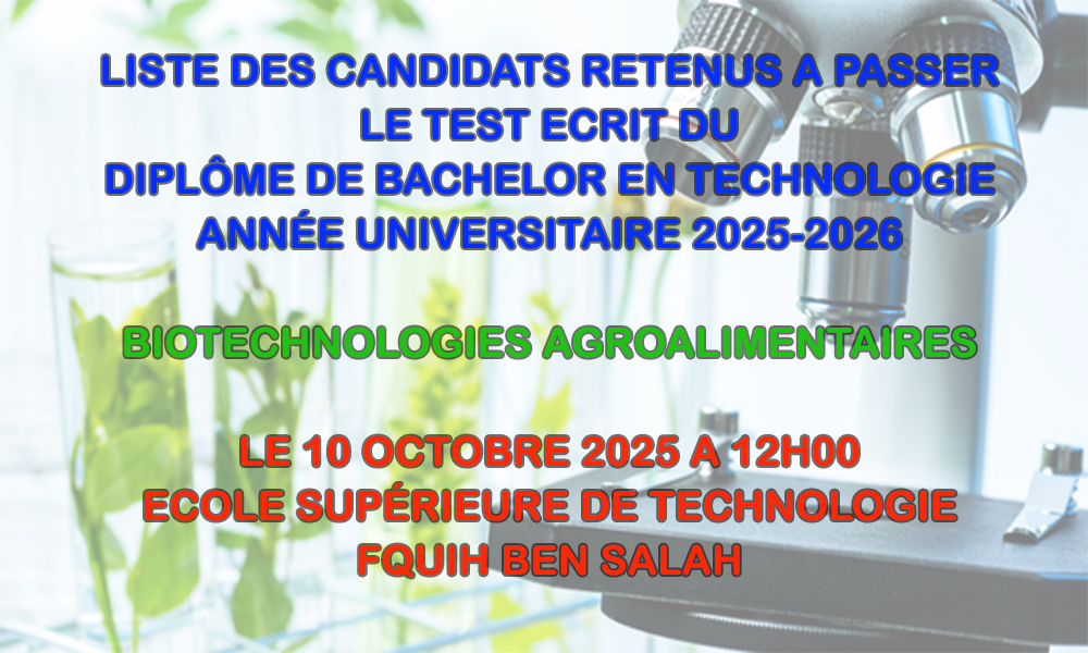 Avis et liste des candidats retenus à passer le test écrit du Diplôme de Bachelor en Technologie Biotechnologies Agroalimentaires au titre de l’année universitaire 2025-2026