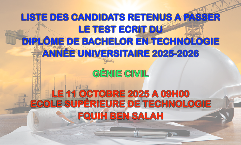 Avis et liste des candidats retenus à passer le test écrit du Diplôme de Bachelor en Technologie Génie Civil au titre de l’année universitaire 2025-2026