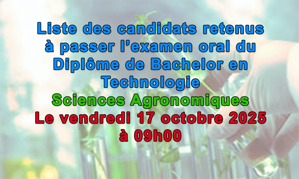 Liste des candidats retenus à passer l’examen oral du Diplôme de Bachelor en Technologie en Sciences Agronomiques au titre de l’année universitaire 2025-2026