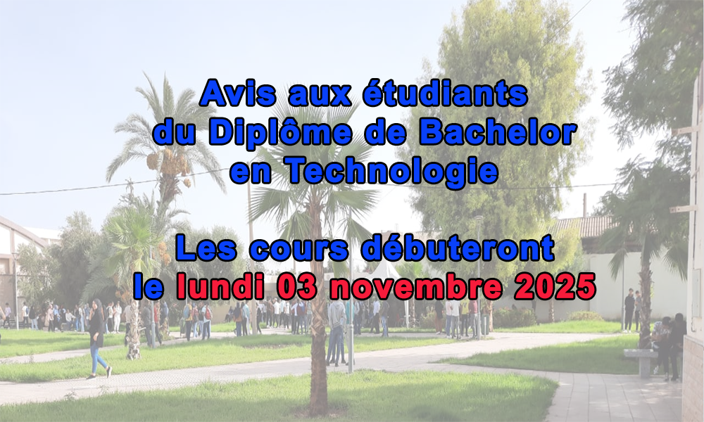 Rentrée universitaire 2025-2026 Diplôme de Bachelor en Technologie Il est porté à la connaissance des étudiants du Diplôme de Bachelor en Technologie que les cours débuteront le lundi 03 novembre 2025. Emplois du temps