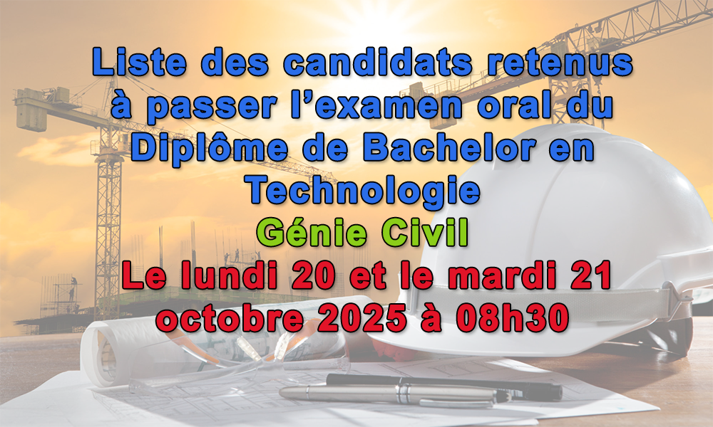 Lire plusListe des candidats retenus à passer l’examen oral du Diplôme de Bachelor en Technologie Génie Civil au titre de l’année