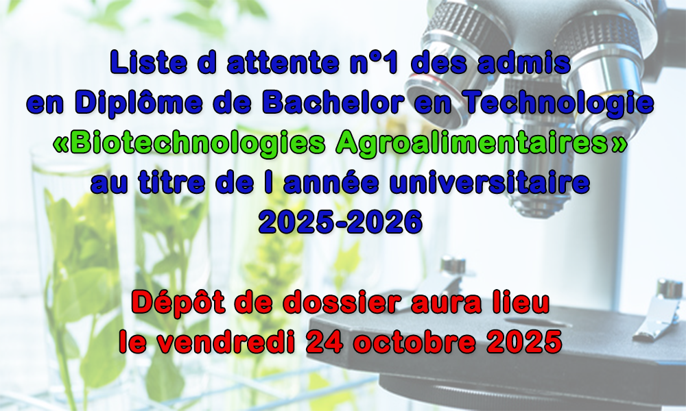 Lire plusListe d’attente n°1 des admis en Diplôme de Bachelor en Technologie « Biotechnologies Agroalimentaires » au titre de l’année universitaire 2025-2026