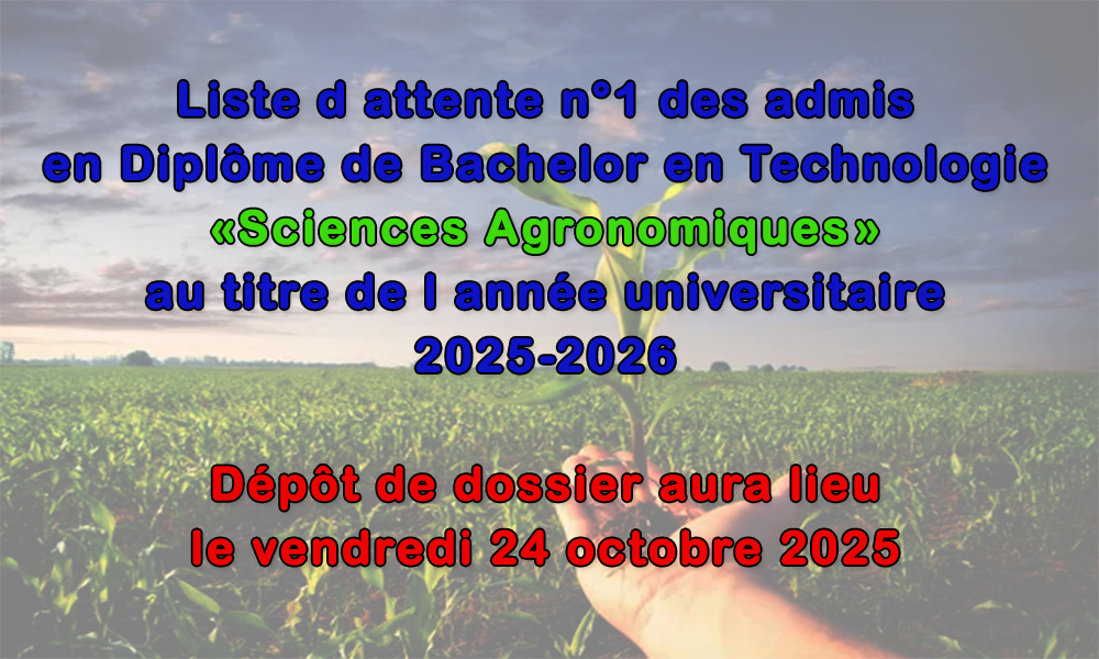 Lire plusListe d’attente n°1 des admis en Diplôme de Bachelor en Technologie « Sciences Agronomiques » au titre de l’année universitaire 2025-2026
