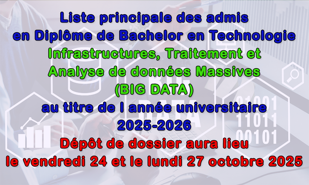 Liste principale des admis en Diplôme de Bachelor en Technologie « Infrastructures, Traitement et Analyse de données Massives (BIG DATA) » au